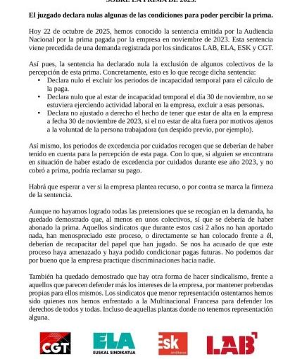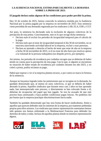 22 de octubre de 2025 Comunicados LA AUDIENCIA NACIONAL ESTIMA PARCIALMENTE LA DEMANDA SOBRE LA PRIMA DE 2023 Posted by Accion Sindical