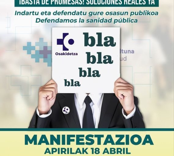 CGT-LKN nahi ditu datorren apirilaren 18an deitutako manifestazioetan parte hartzera, argi eta garbi esateko promesaz eta propagandaz nazkatuta gaudela eta Osakidetzaren arazoei benetako irtenbideak exijitzeko