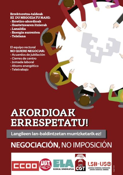 Lankide agurgarriak:   Negoziazio mahaitik altxatuta jarraitzen dugu, errektoretza-taldeak erretiroen akordioa negoziatzeko borondaterik ez duelako. Dakizuenez, aurreko akordioa bertan behera