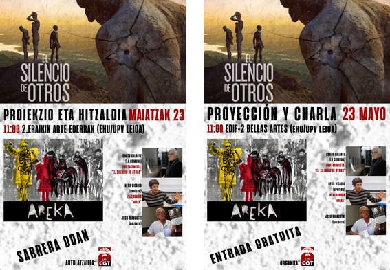 “El silencio de otros” pelikula eta “Areka” laburmetraiaren proiekzioa eta ondoren eztabaida/hitzaldia protagonista eta zuzendariarekin. ‘El Silencio de otros’ filmak