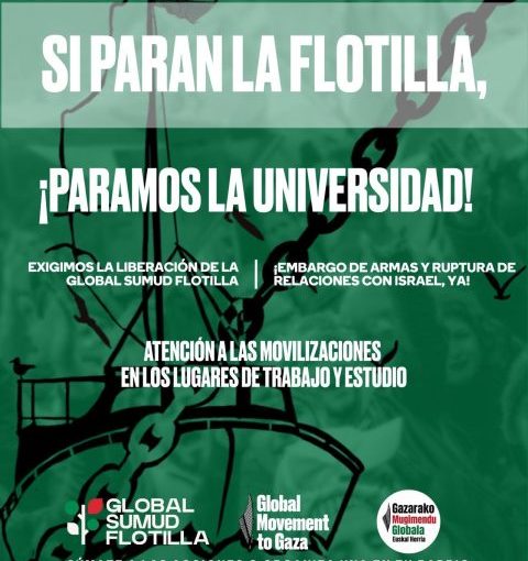 23 septiembre, 2025 No comments SI PARAN LA FLOTILLA, ¡PARAREMOS LA UNIVERSIDAD! PALESTINA ETA FLOTILLA AURRERA! ¡ATENCIÓN A LAS MOVILIZACIONES! Ante el genocidio que Israel está cometiendo en Gaza, y las decadas de apartheid y limpieza étnica sobre Palestina, la